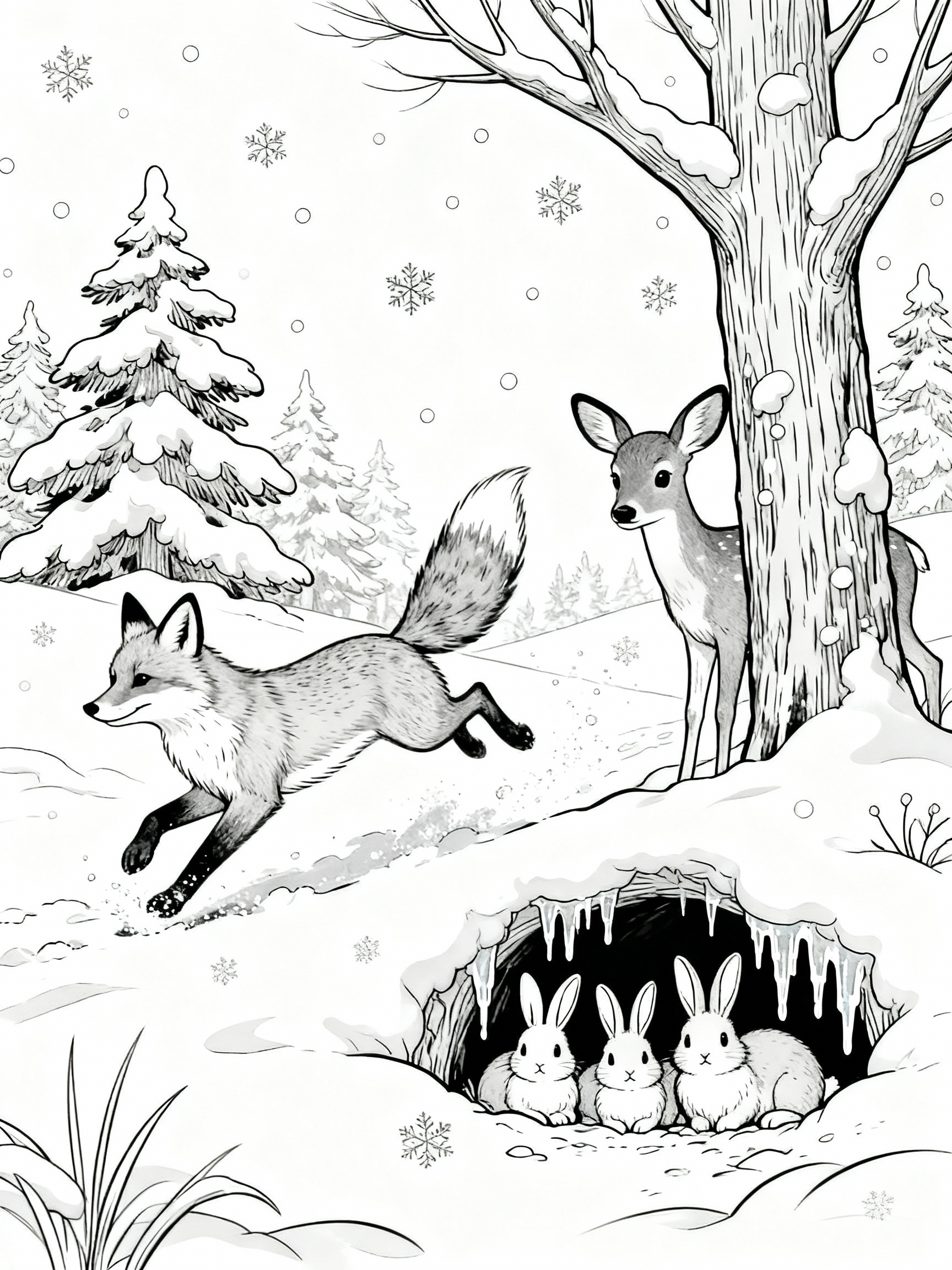 Through coloring, children learn empathy by exploring the challenges animals face in winter. Imagining how a rabbit stays warm or how a fox finds food helps kids build understanding and compassion.