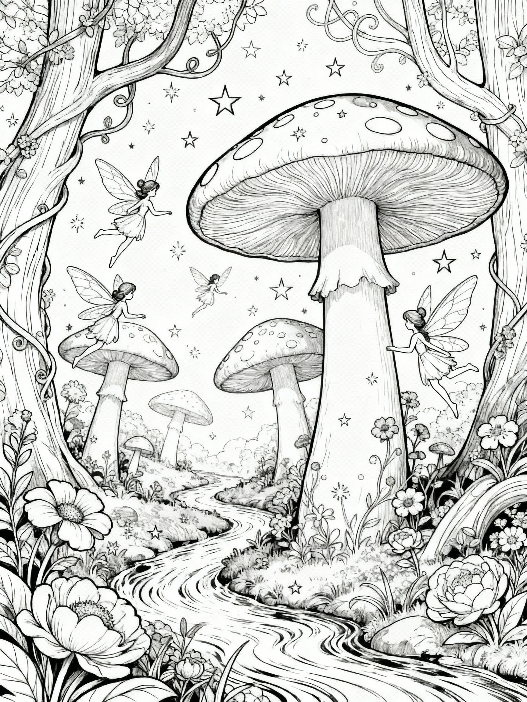Intricate leaf patterns and swirling vines offer mindful coloring moments, perfect for relaxation. Challenge yourself by searching for hidden creatures—tiny owls, foxes, or butterflies—tucked into the scene. This playful aspect adds an extra layer of fun to every fairies coloring page.