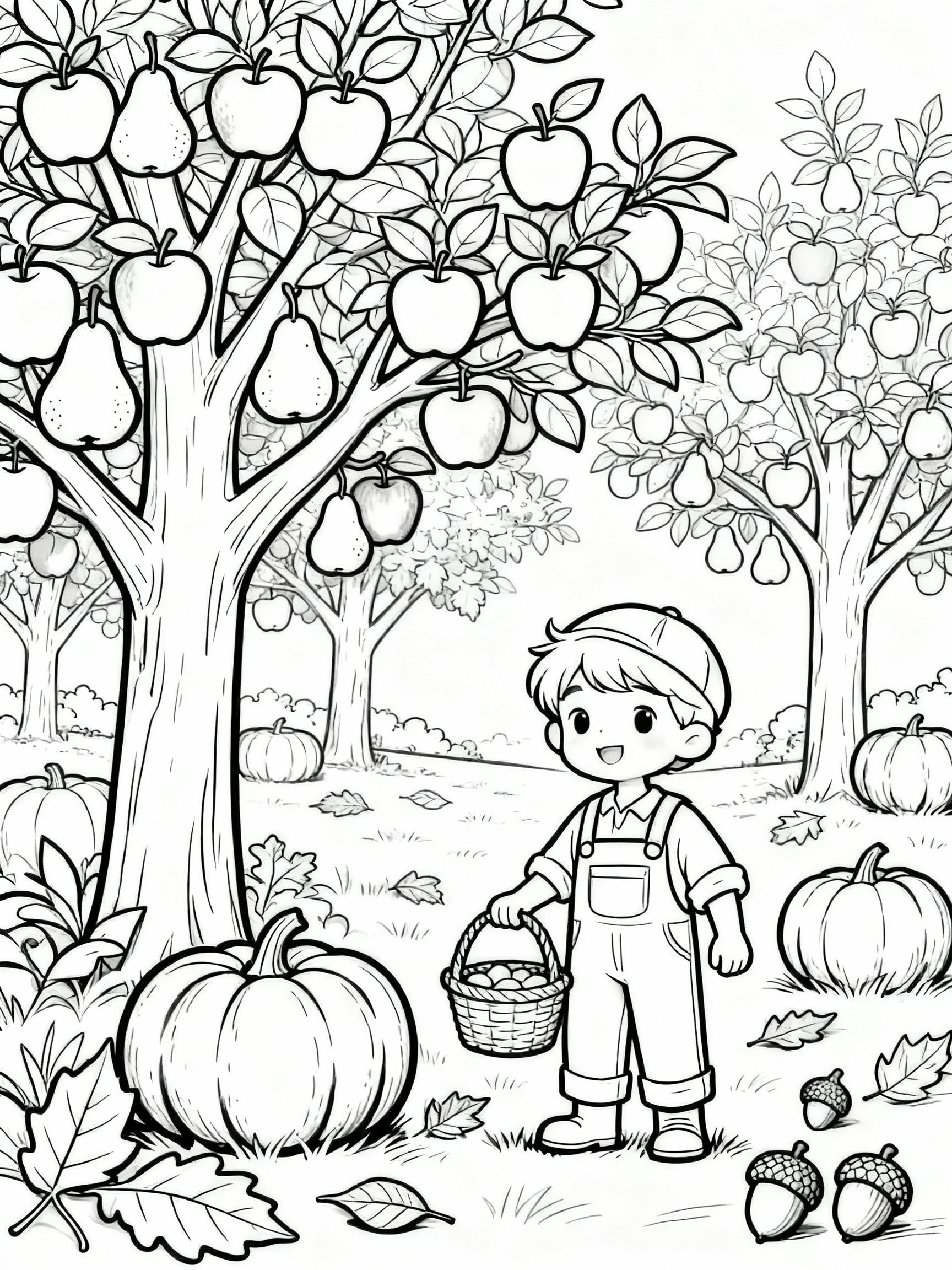 Bright and cheerful, the Joyful Cartoon Autumn Orchard Adventure Coloring Page is designed for younger artists, overflowing with delightful characters and whimsical details that inspire laughter and creativity.