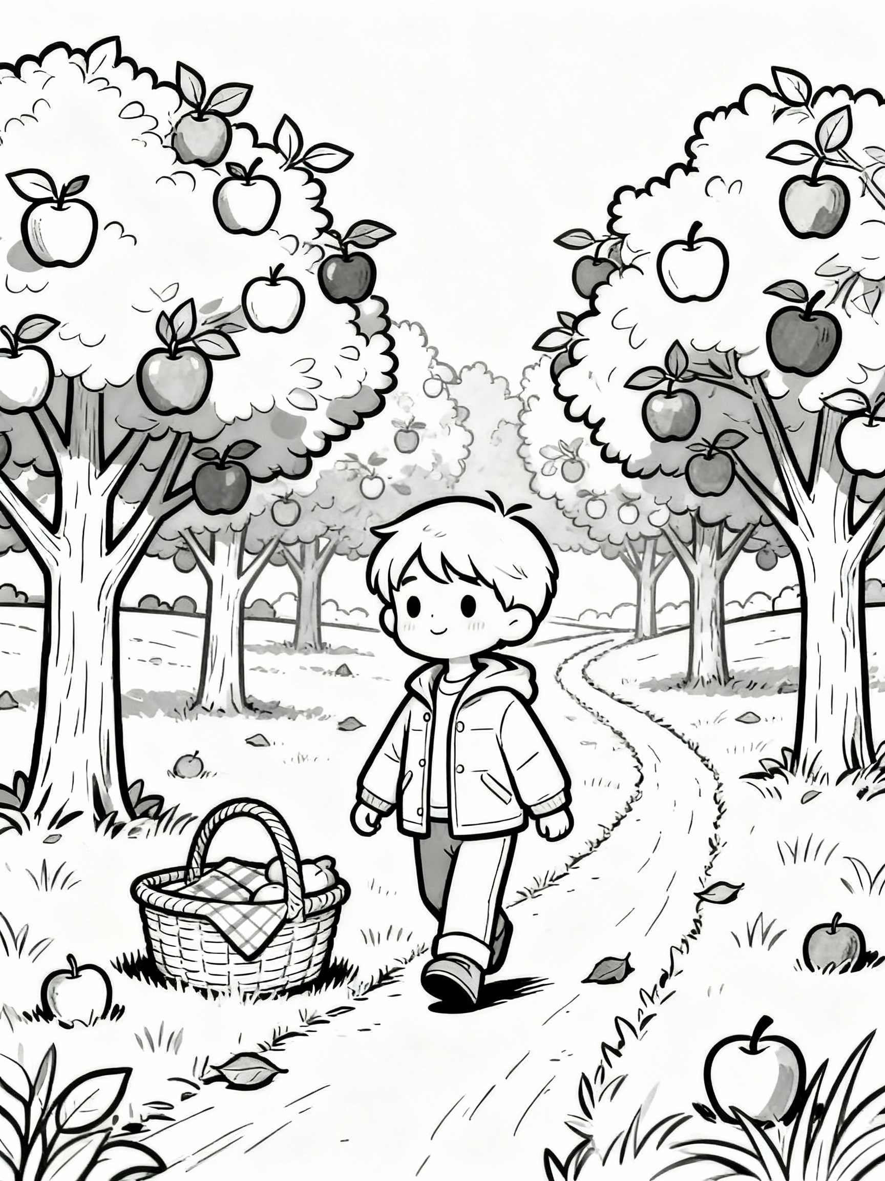 Dive into a serene landscape with the Lovely Autumn Orchard Adventure Coloring Page, featuring beautiful scenery that provides a delightful challenge suitable for both teens and adults.