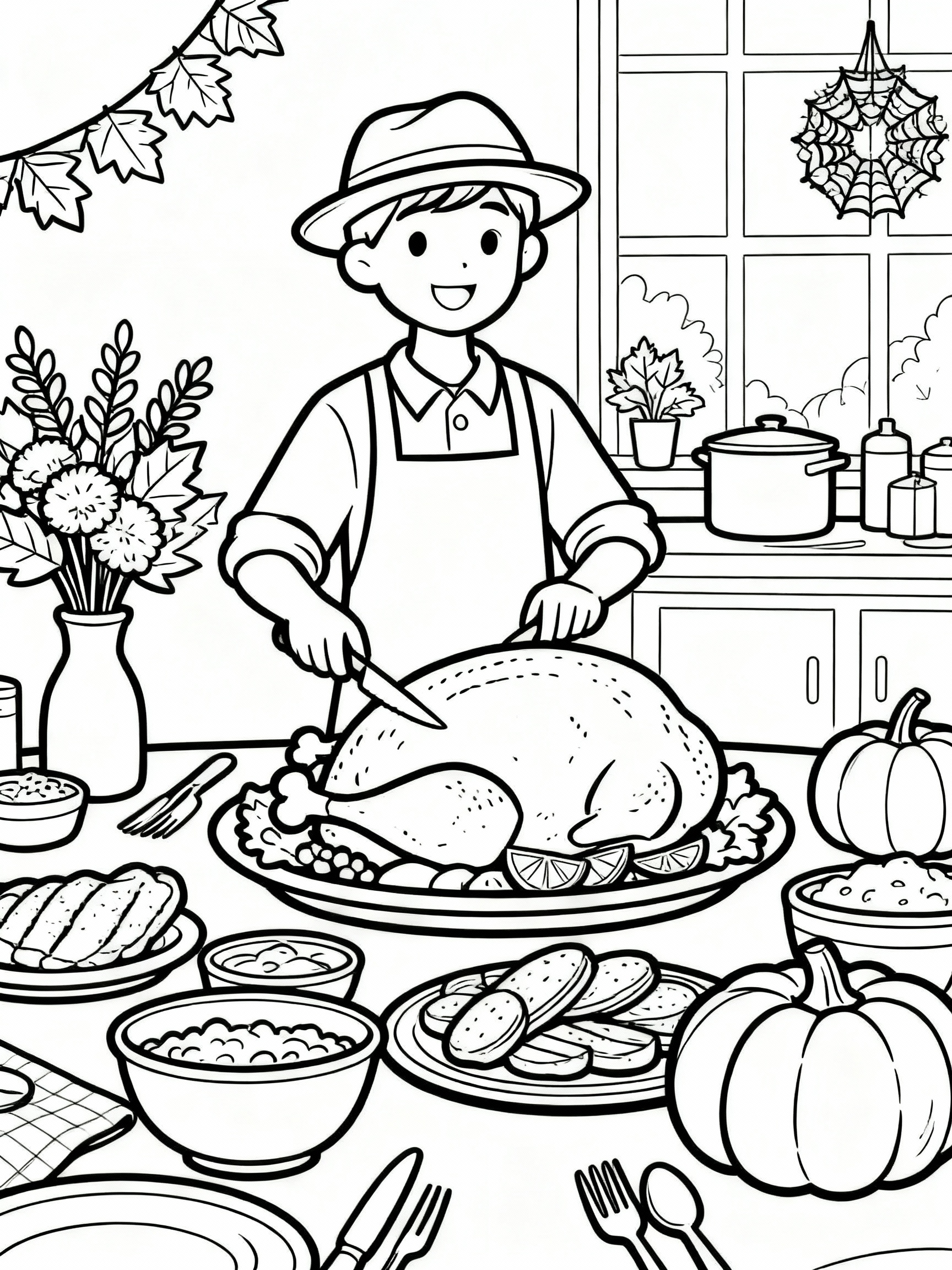 Experience the warmth of Thanksgiving with the Perfect Thanksgiving Feast Preparations coloring page, showcasing a beautifully laid table brimming with festive foods. This design is great for families and budding artists aged 7 and older, encouraging bonding time through creativity.