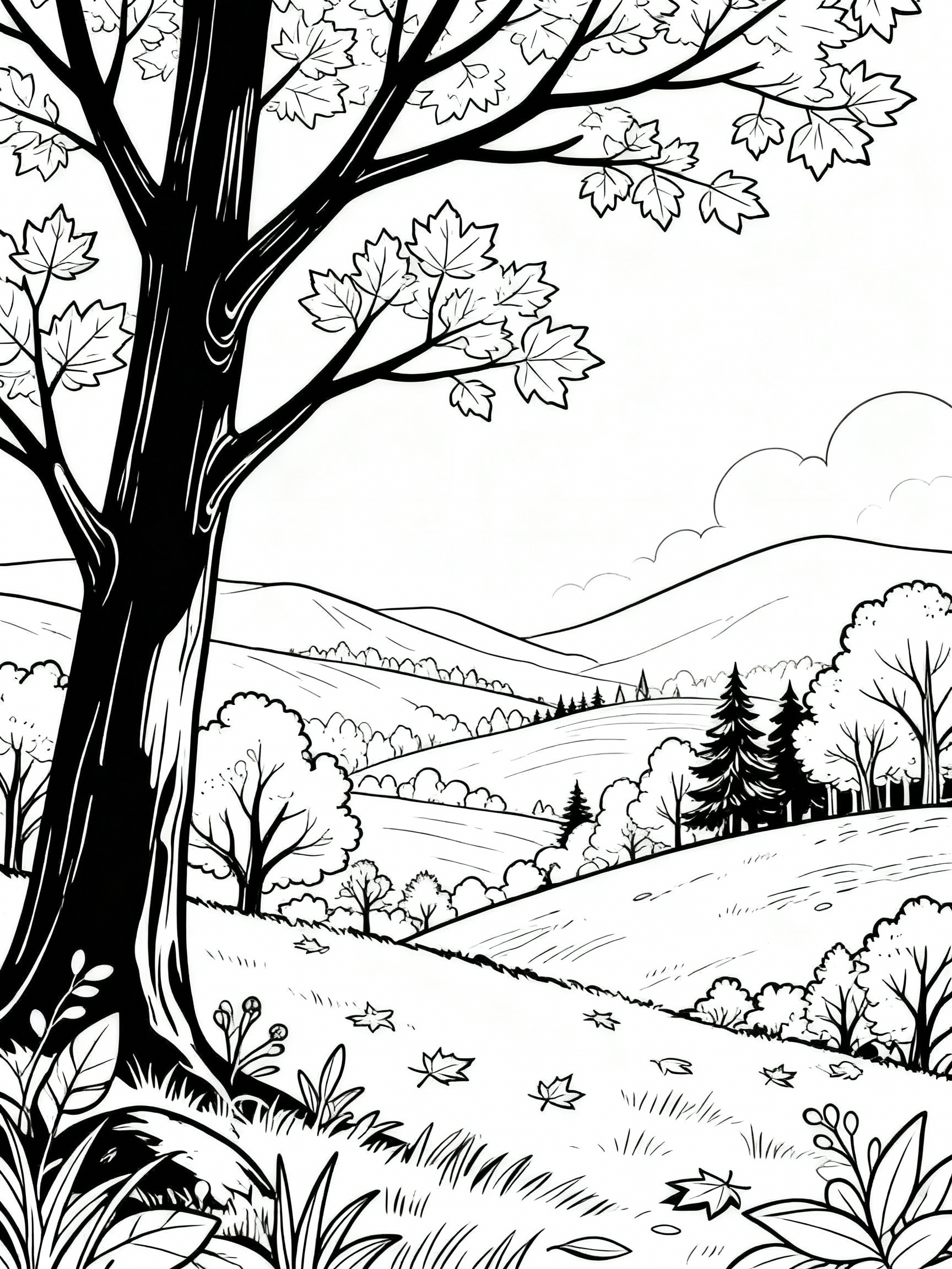 The Enchanting Enchanted Autumn Landscapes Coloring Page whisks you away through dreamy meadows and magical trees, ideal for middle-schoolers and adults searching for a whimsical and captivating coloring journey.