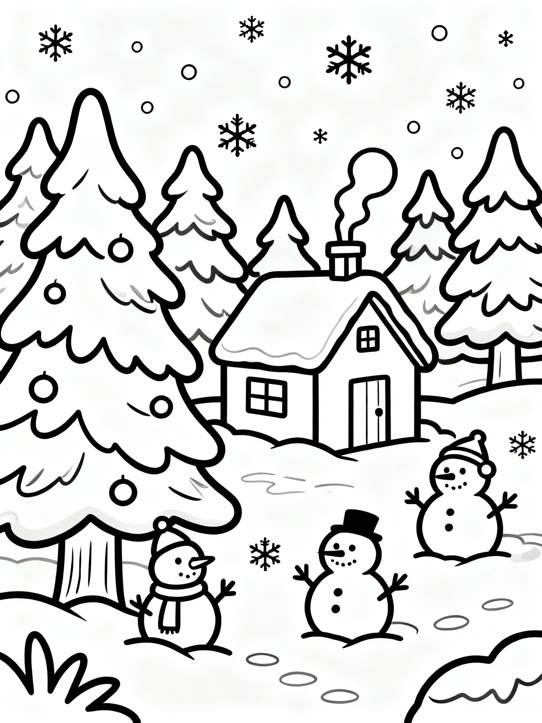 Immerse yourself in a delightful scene of a whimsical winter wonderland adorned with charming decorations, perfect for sparking creativity in both kids and adults alike, and offers a moderate level of detail for an engaging coloring experience.