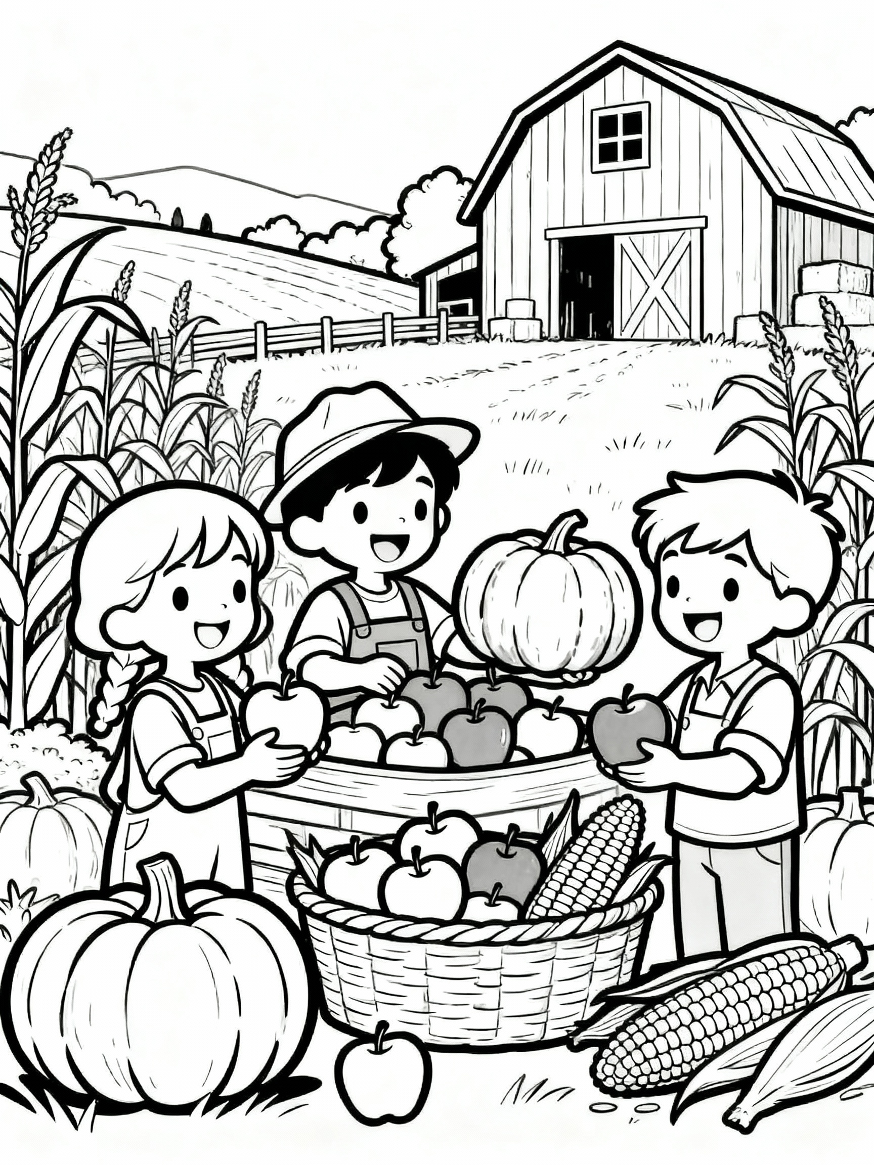 The Outstanding Joyful Harvest Gathering coloring page shines with unique details and character, suitable for ages 9 and up, making it a fantastic choice for anyone looking to create impressive, colorful masterpieces.